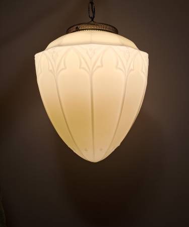 This ornate and elegant antique art deco embossed vaseline glass / custard glass pendant light would look right at home in a Victorian home foyer, hallway, or study.