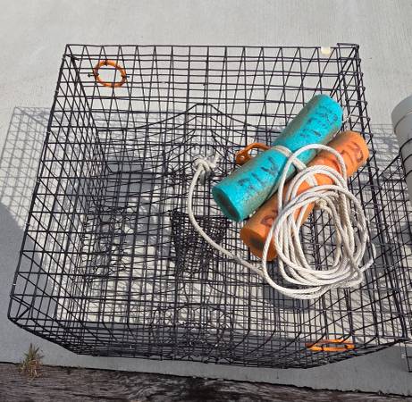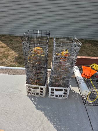 29 stackable crab traps 22.00 ea. Traps have both spring bait and snoot bait catches. Rigged with lines of different lengths from 10 to 15 ft long with foats.