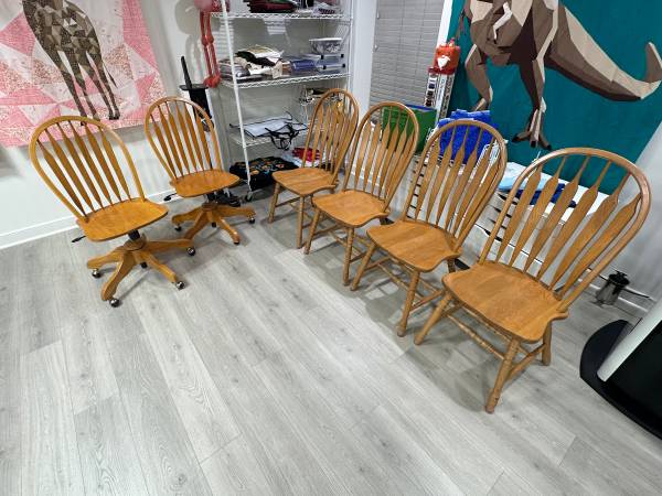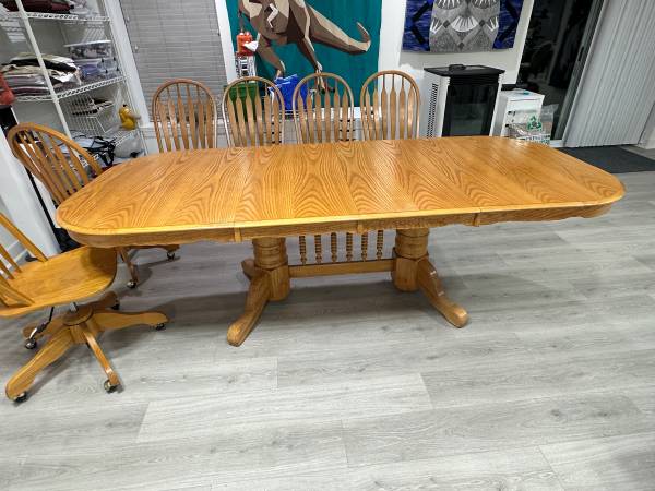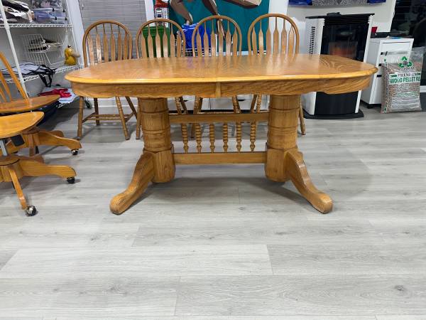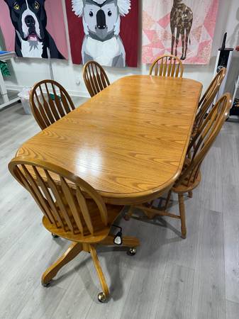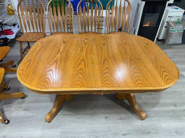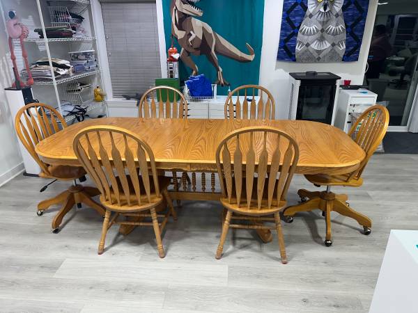 Very nice solid oak dining table with 6 chairs. Extends from 5’ to 8’ with 2 - 18” leafs. $500 located in Gettysburg area.