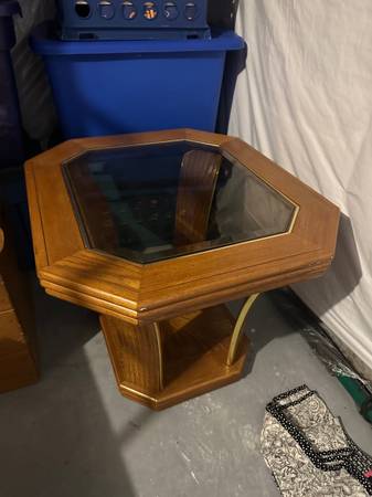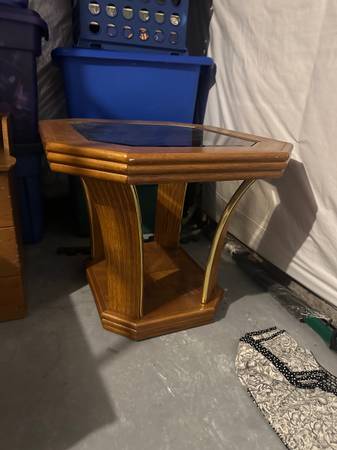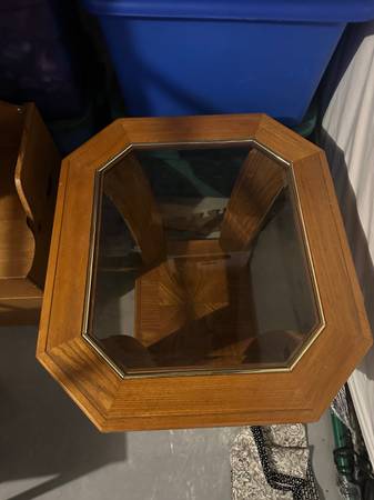 Good condition oak end table with tinted glass top. $10. Located in Gettysburg area.
