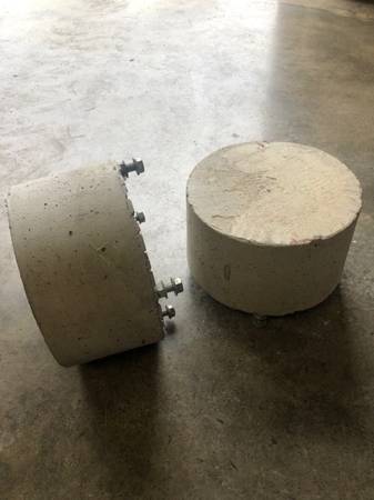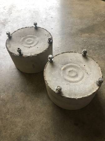 Concrete wheels weights for tractor. 45 lbs. each Bolts are 10” on center $20 for the pair