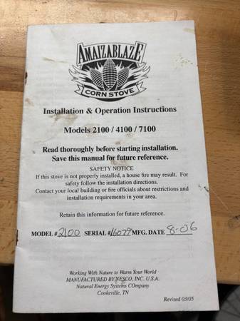 Amaizablaze corn stove. Will burn corn soy beans or wheat. Works well
