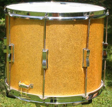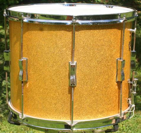 Here's a 1961-62 Ludwig 12x15 parade snare drum in gold sparkle. Chrome over brass rims, no extra holes or modifications, no serial # badge, new bottom head. Excellent condition from a smoke free...