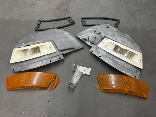 Original front turn signal set from a 240z. The valances are in good shape, no cracks or bends, epoxy coated on the back. The turn signal housings are good and the bulb reflectors are stainless steel. The original reflectors are included. The amber lenses need repair and the rubber lens grommets are in very good condition. All pulled from a single car.