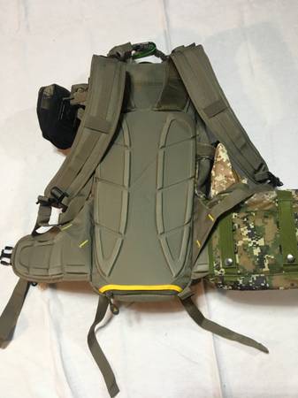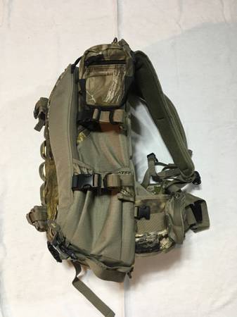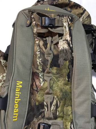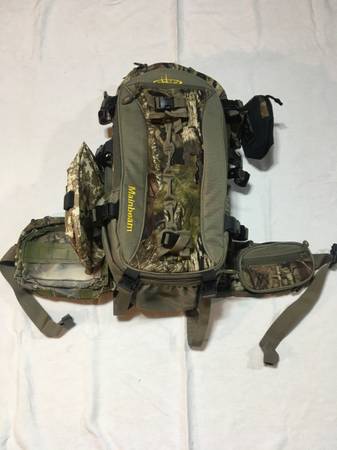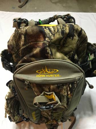 For Sale: Horn Hunter ‘Main Beam’ backpack. This is a high quality heavy duty Camo pack, great for hunting or general use with an internal aluminum frame and 2,800 cu inch storage. The pack is particularly useful for saddle hunting (see photos) when you are packing your climbing sticks and platform. This pack has multiple compression straps. There are 3 straps on EACH side and 2 on the bottom and 2 more small straps on the front. I suggest you checkout the Main Beam pack at their website at Hornhunterpacks.com OR on YouTube. The pack retails for 199; you can find them on sale for around 179. It is my favorite pack. I have two of these packs so I’m selling of one. I added some additional small utility pouches on the outside of my packs that I use for flash lights, cell phone, keys, pull-up rope etc. They are included but they are easily removed if you want them off. The pack also comes with a rain fly, meat shelf (if you pack out quarters) and an internal utility pouch, these items are totally detachable from the pack. The pack is extremely versatile. In a couple of the photos, I attached my sticks and platform for demo only. My Tethrd sticks and platform are NOT included. It is the pack only! $120.00. Call, text: 7one7-3six0-0three64
